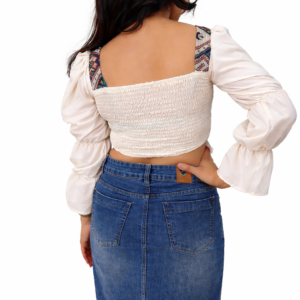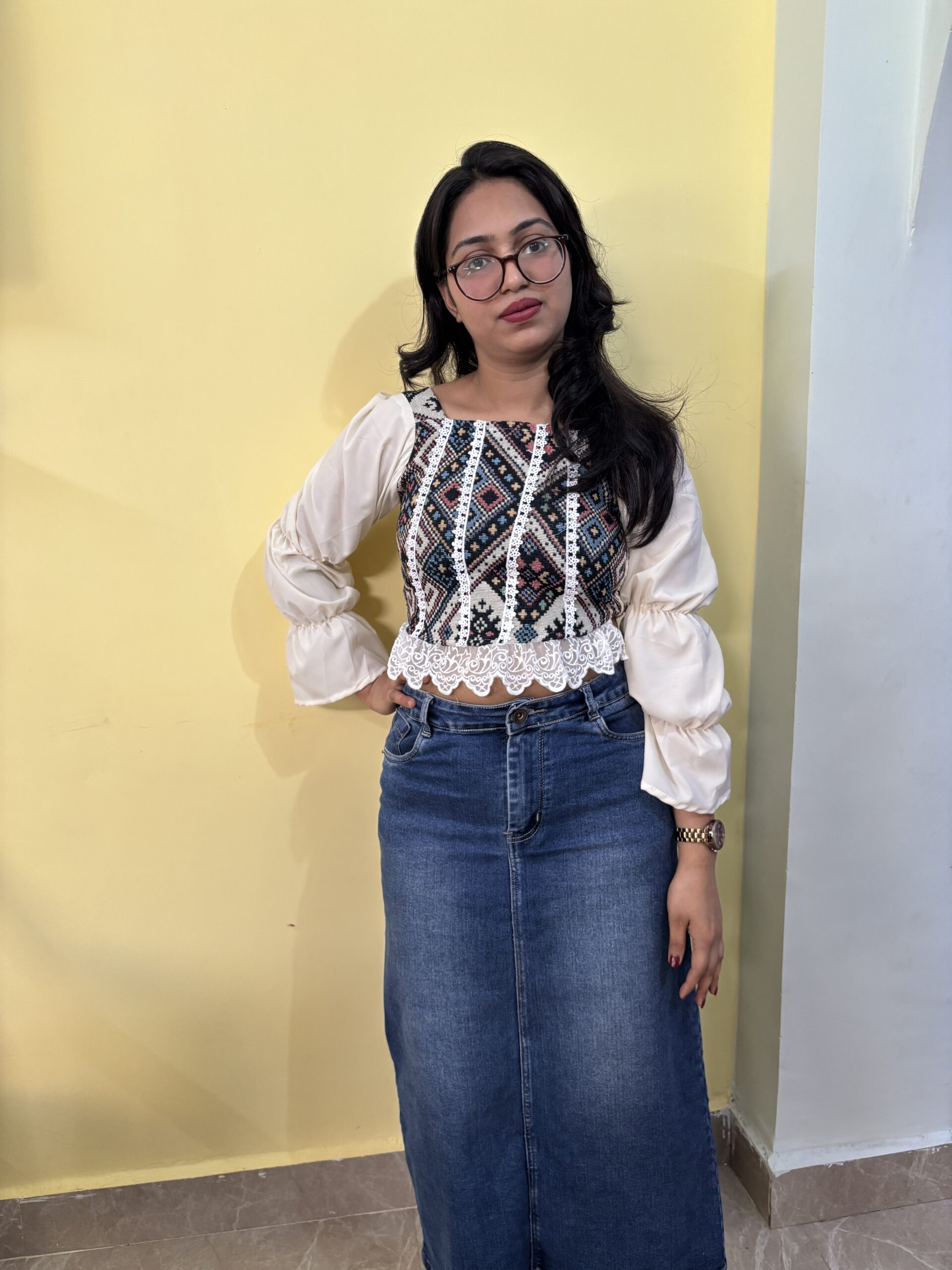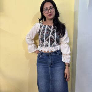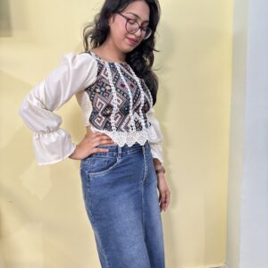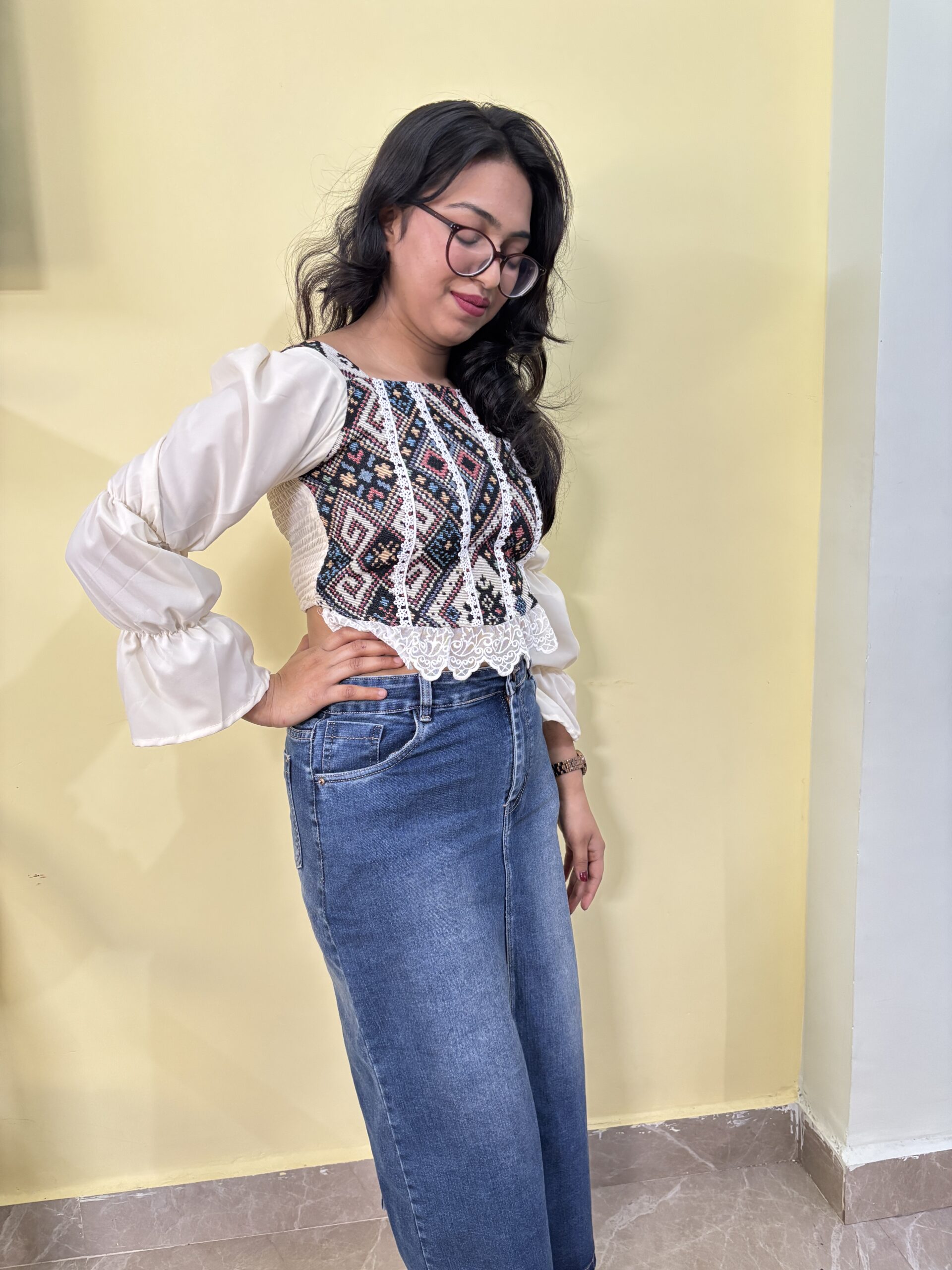 Elevate your everyday style with this trendy boho-inspired crop top featuring a beautifully embroidered geometric front panel. Designed with soft puff sleeves and a delicate lace hem, this top perfectly blends ethnic charm with modern fashion—ideal for casual and fusion wear looks.