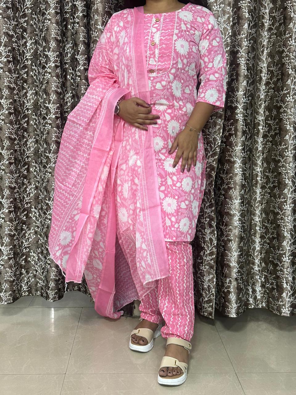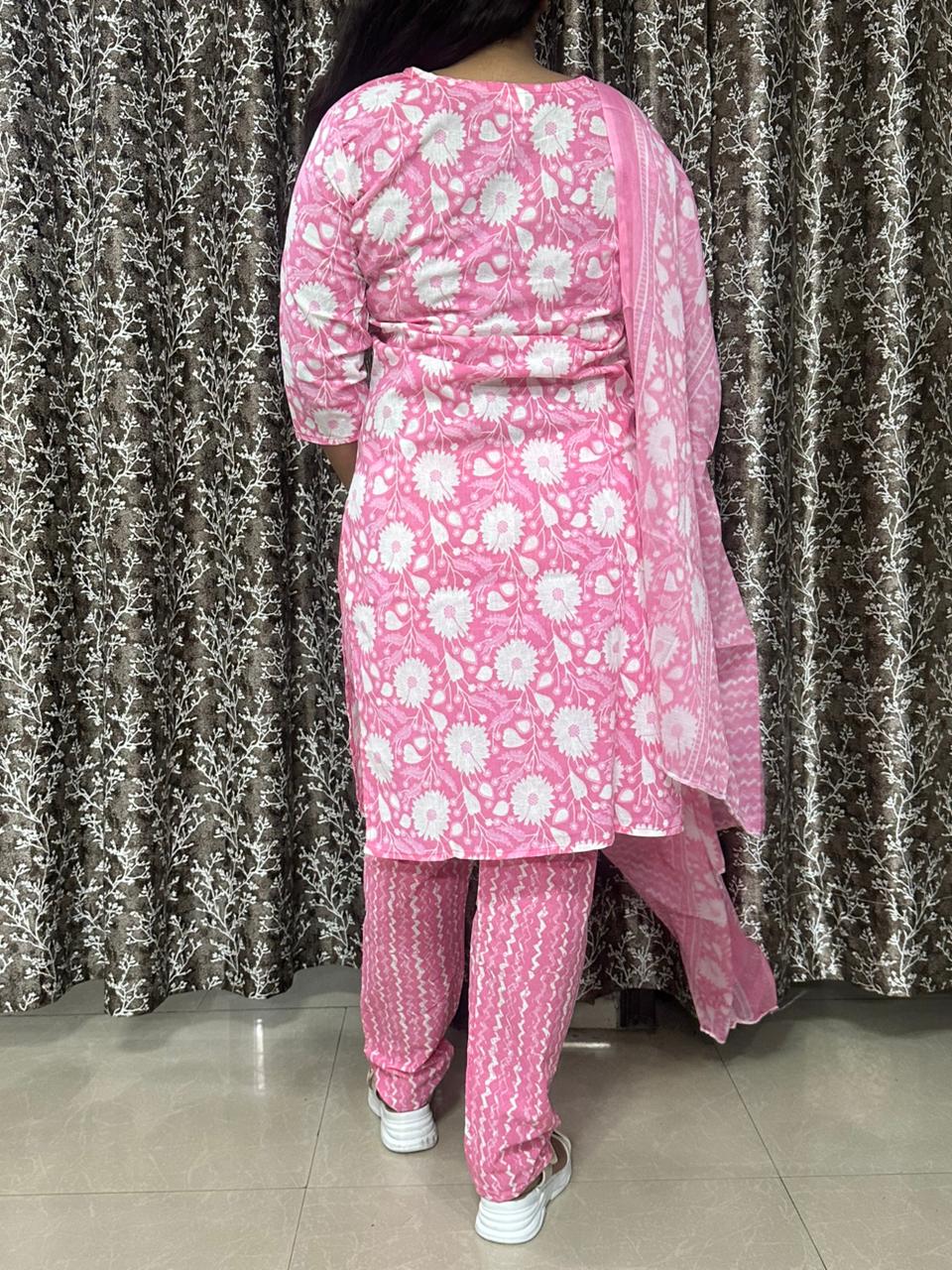 Elegant Pink Pure Cotton Printed 3-Piece Suit Set with Dupatta