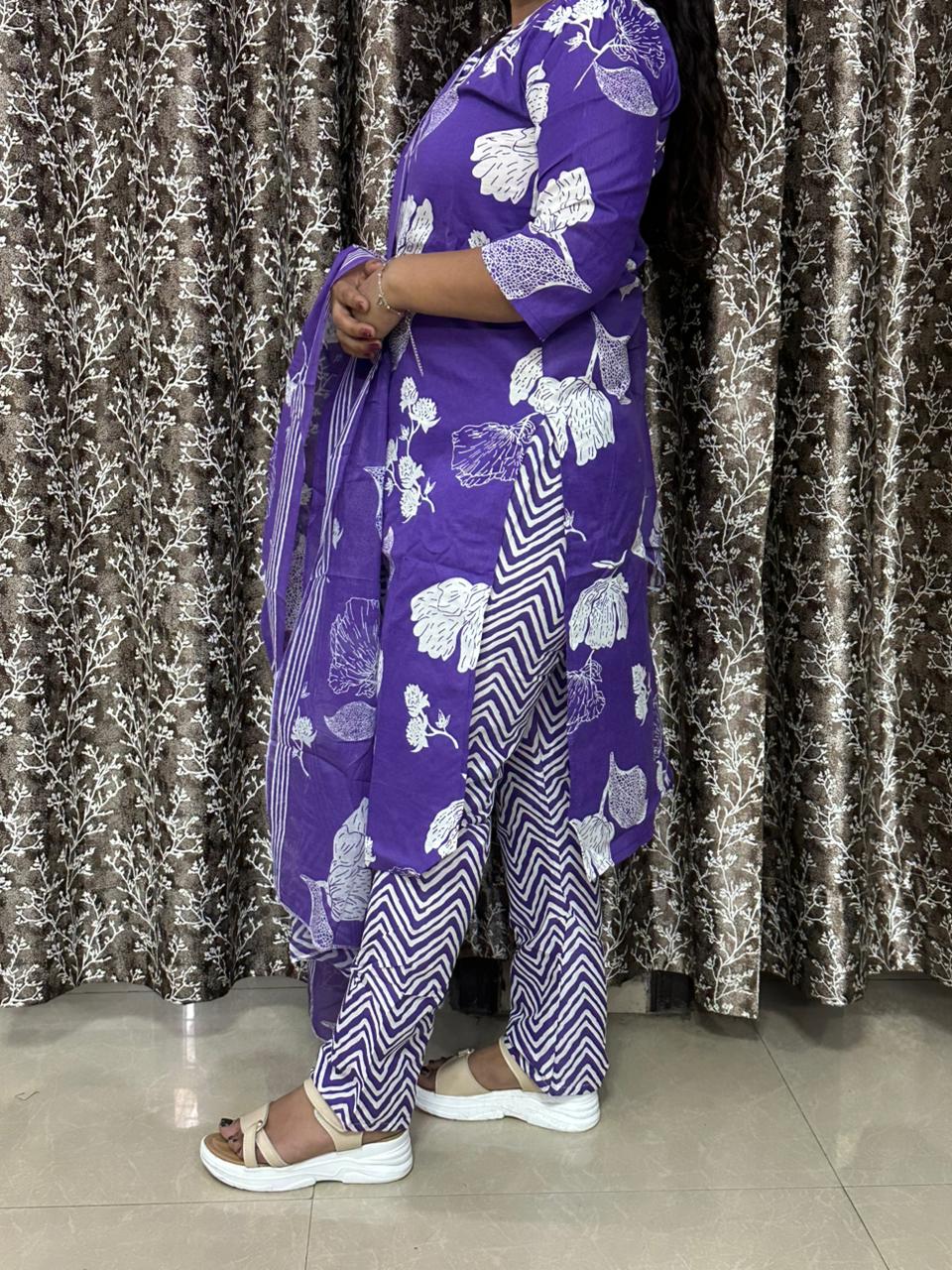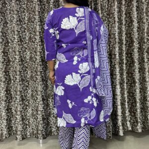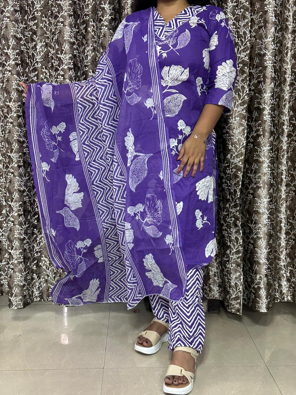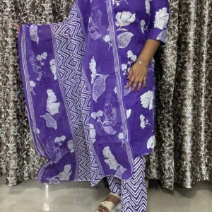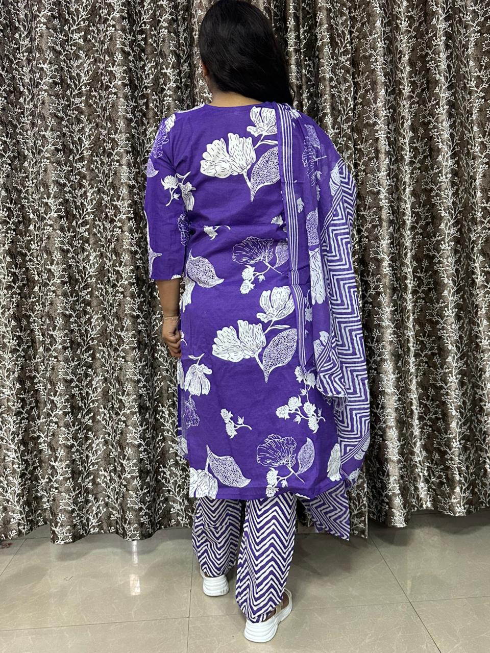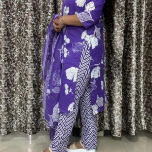 Add a vibrant touch to your ethnic collection with this beautiful purple printed 3-piece suit set. Designed with eye-catching floral and abstract prints, this outfit blends traditional charm with modern style. The soft cotton fabric ensures maximum comfort, making it perfect for everyday wear, office looks, or casual outings.