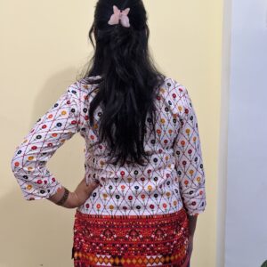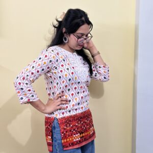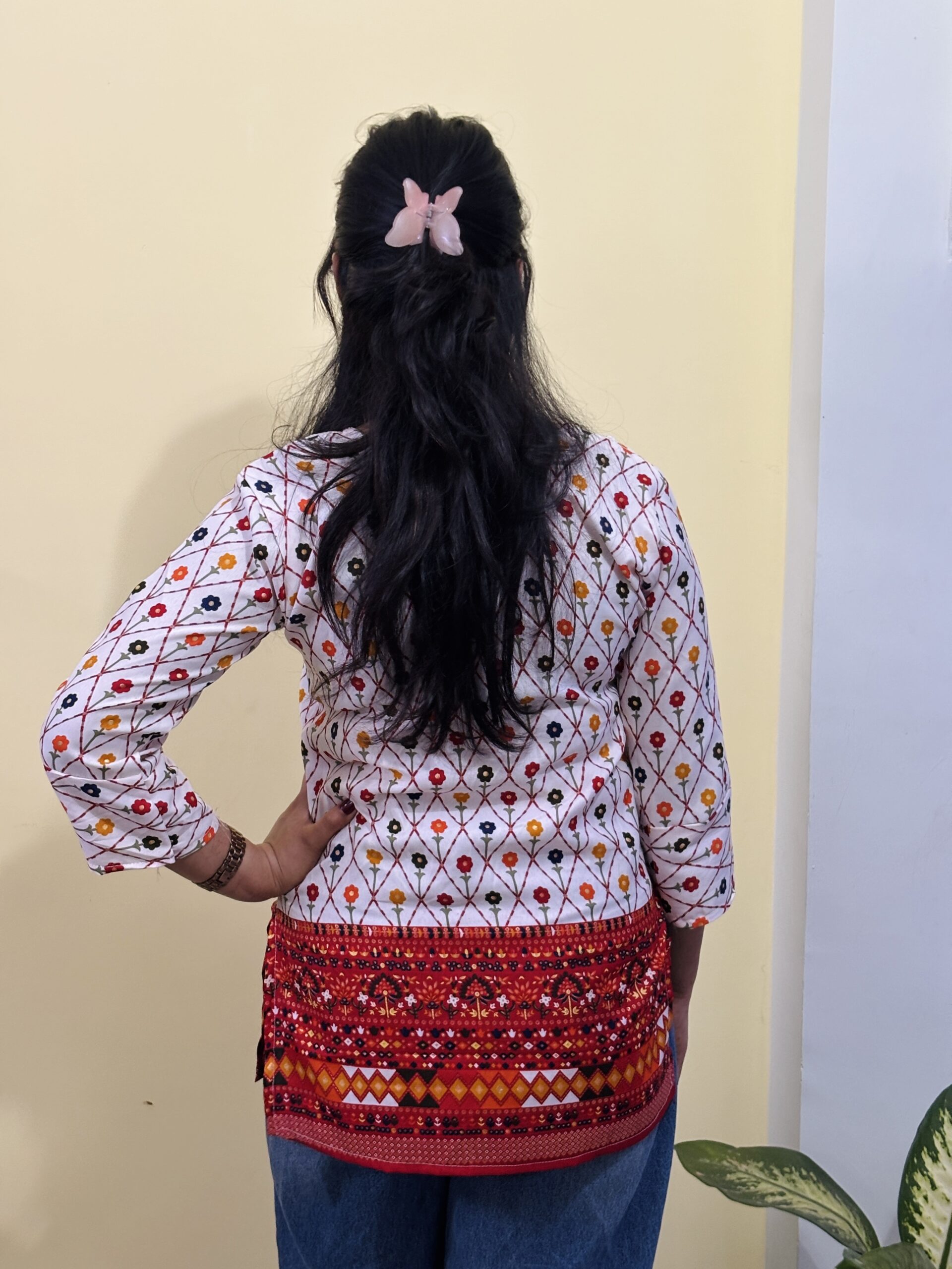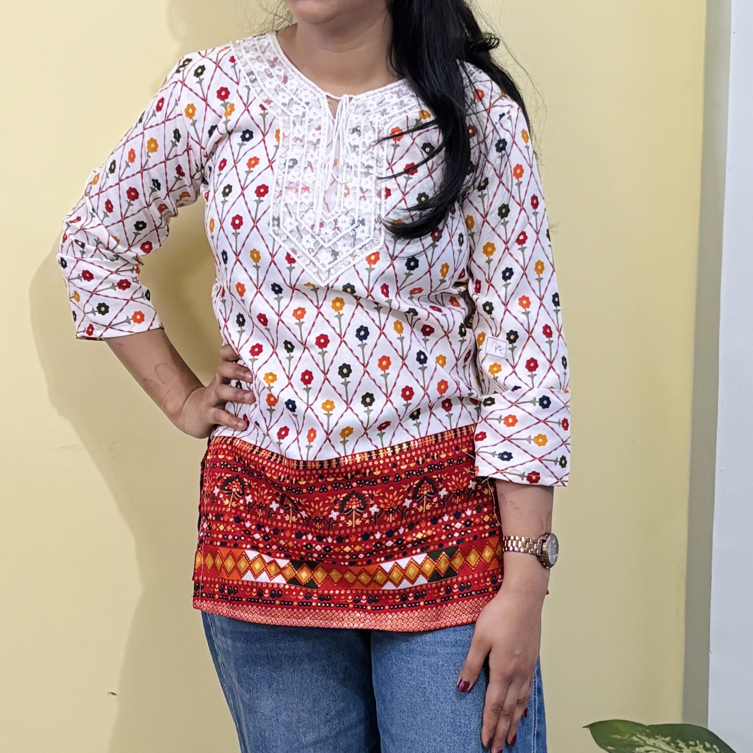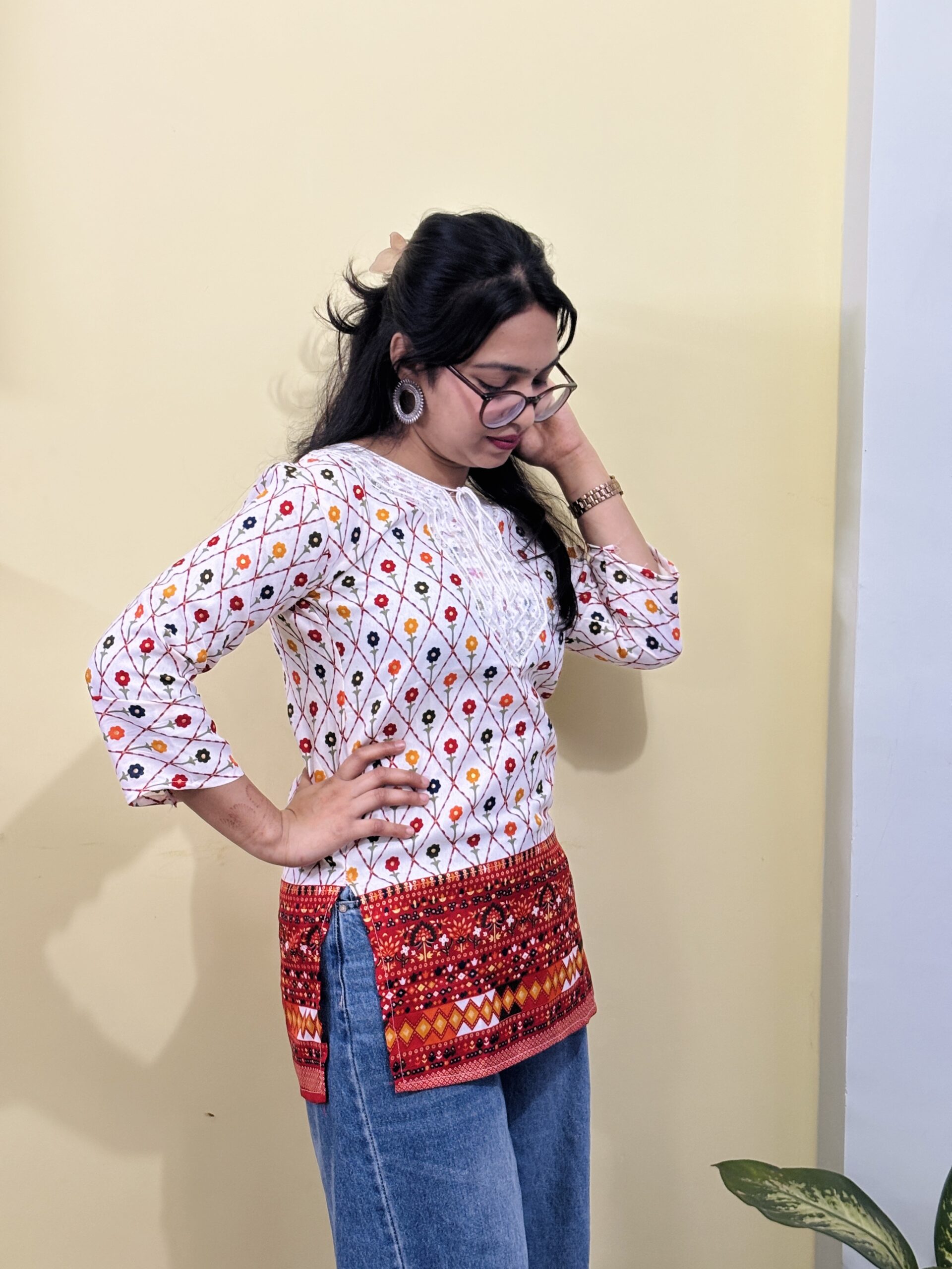 Bring vibrant ethnic charm to your wardrobe with this beautifully designed kurti featuring a delicate floral print and intricate embroidered yoke. The contrast ethnic border at the hem adds a bold statement, making it perfect for everyday wear with a stylish twist.