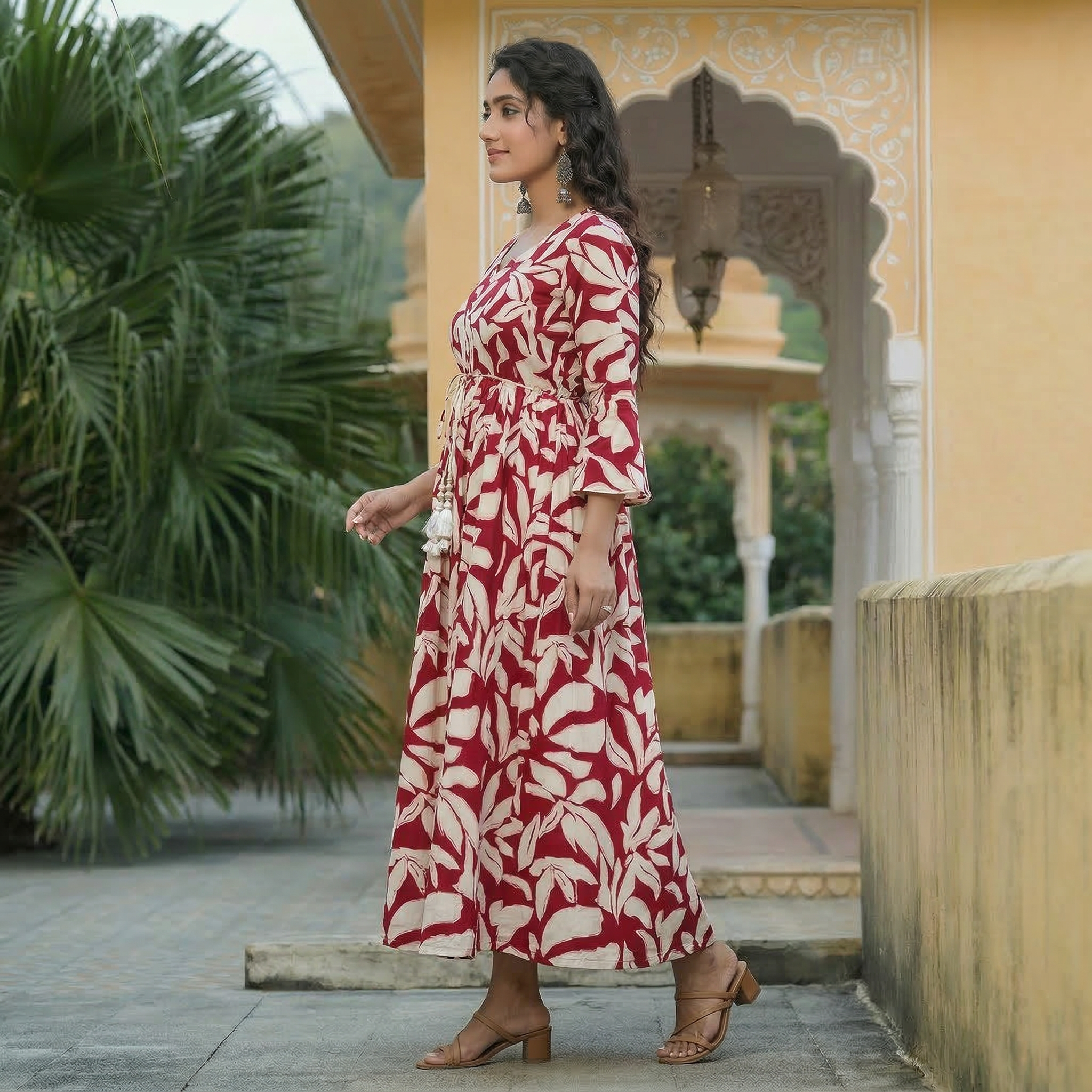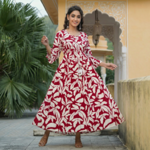 Make a bold style statement with this beautifully designed red floral Anarkali kurti. Crafted with a flowy silhouette and detailed with an all-over beige leaf print, this piece perfectly blends traditional charm with modern elegance.