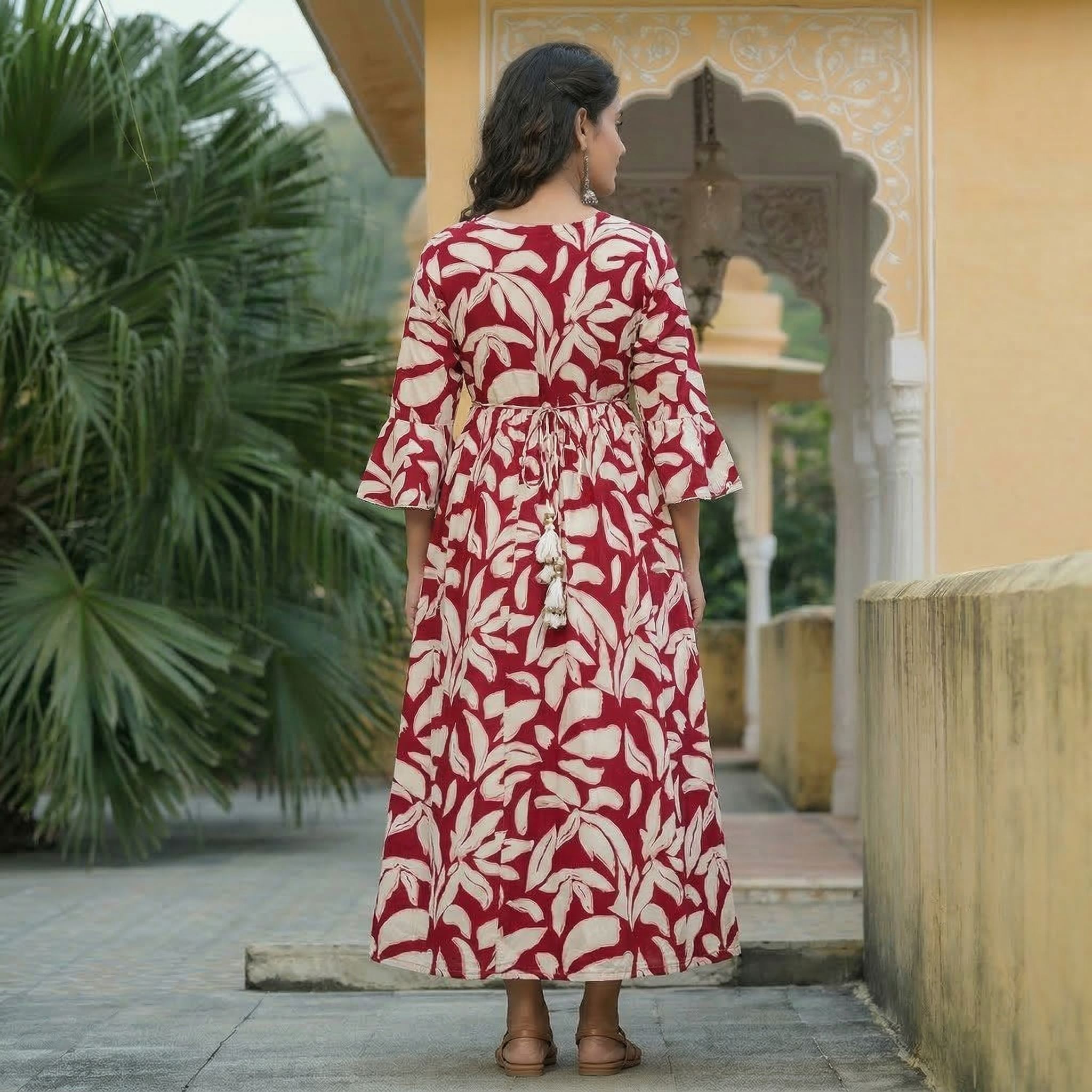 The gathered waist enhances the flare, creating a flattering look for all body types, while the tassel detailing adds a festive touch. Its breathable fabric ensures comfort throughout the day, making it ideal for both daily wear and special occasions.