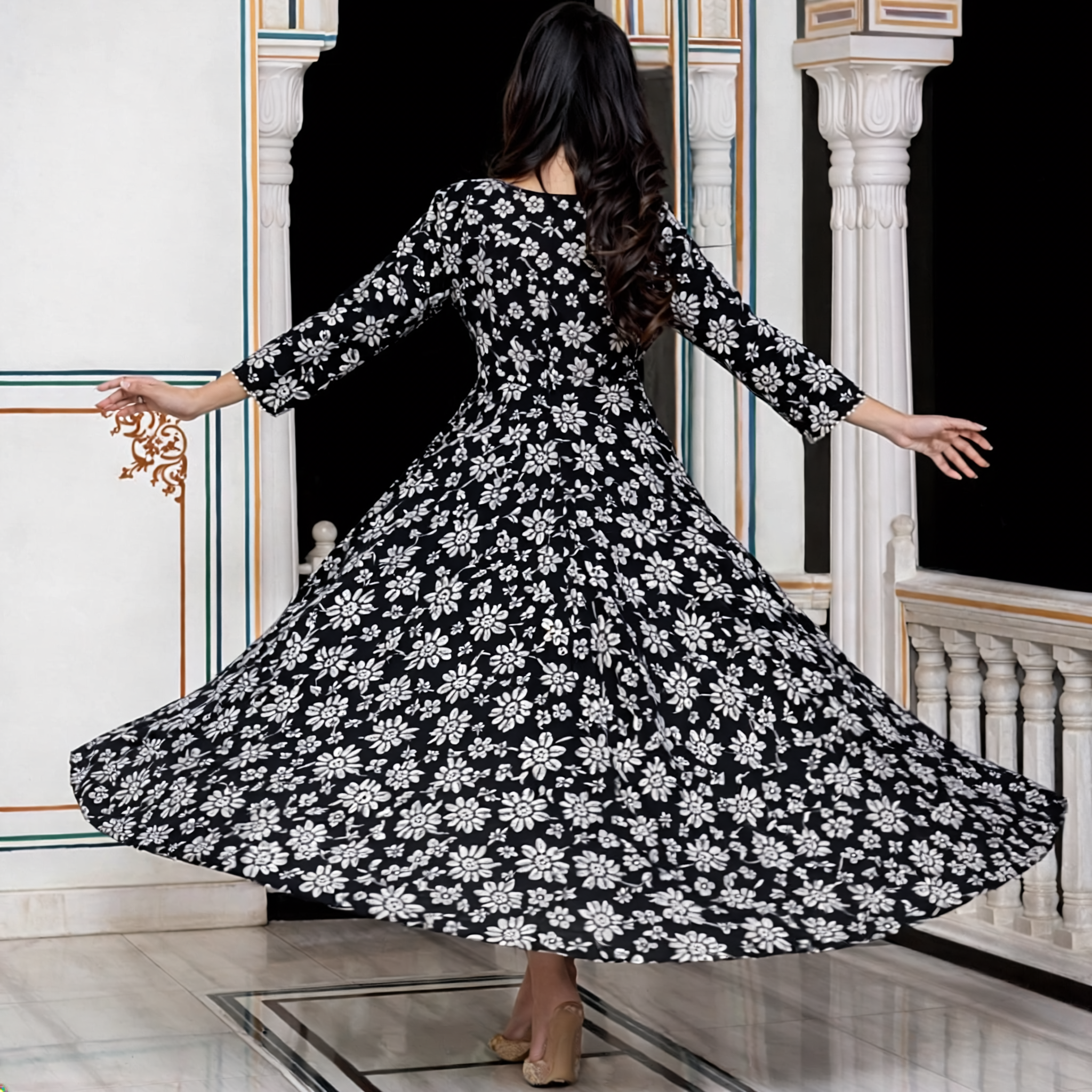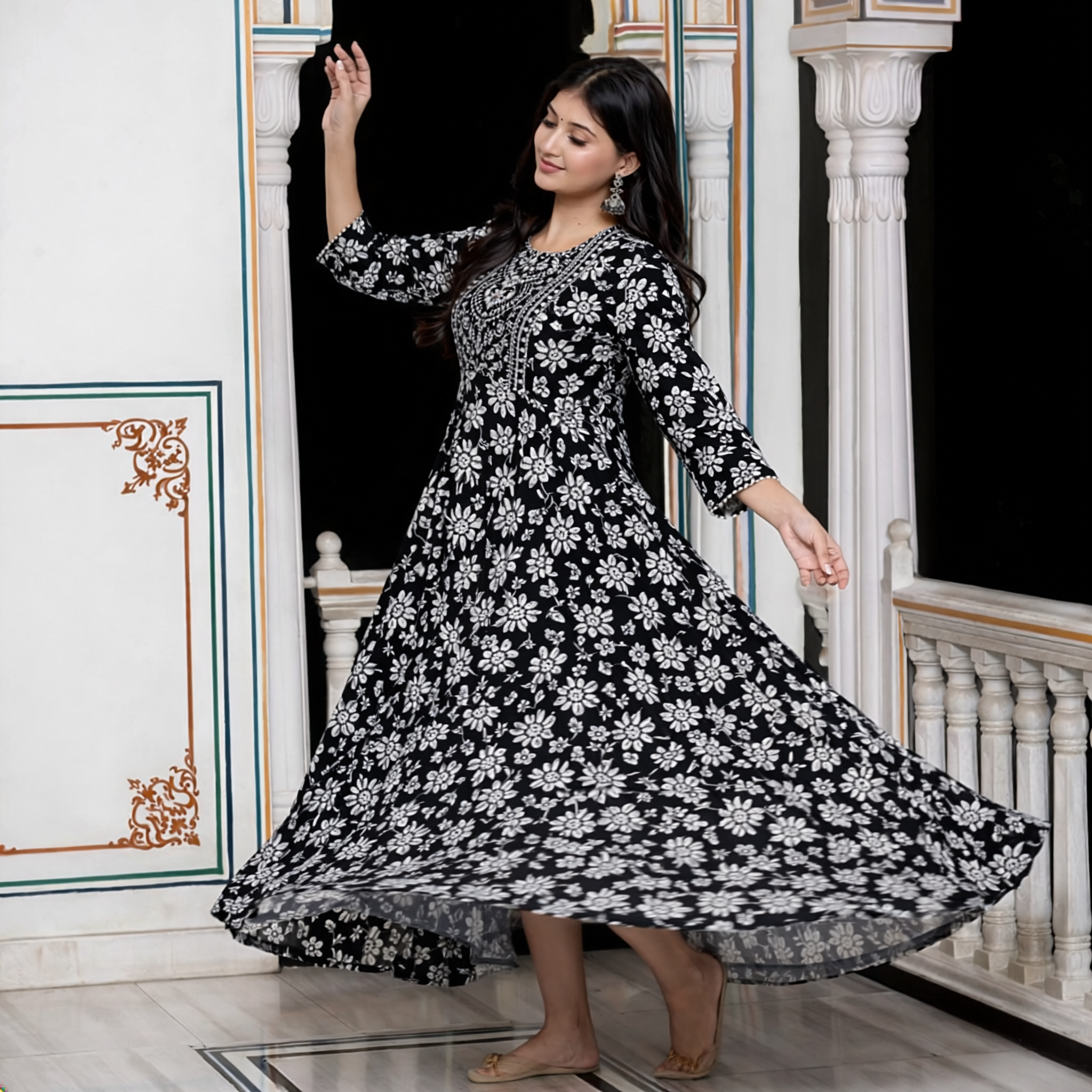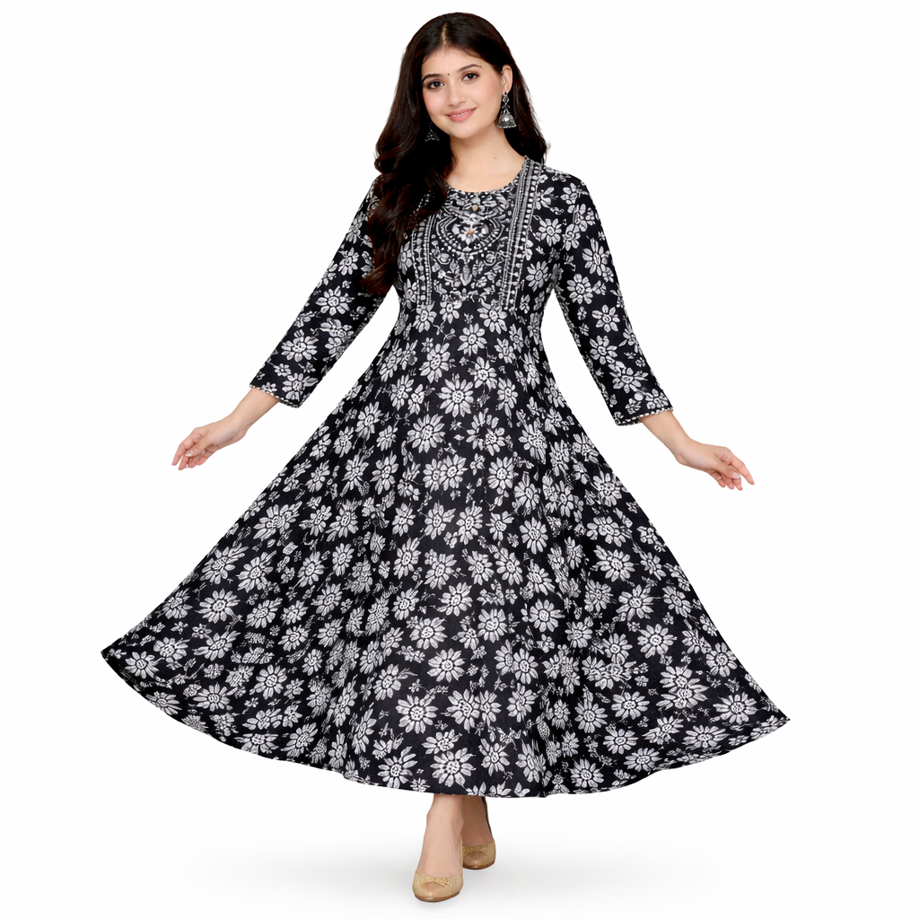 Step into elegance with this stunning black & white floral Anarkali kurti, designed to give you a timeless ethnic look. The intricate floral print combined with a beautifully detailed yoke enhances the overall appeal, making it perfect for both everyday wear and special occasions.