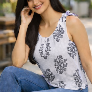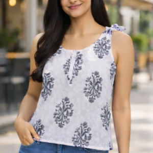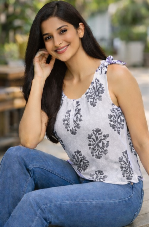 The sleeveless cut and lightweight feel make it perfect for summer wear, while the subtle print adds a graceful touch suitable for casual outings, college, or relaxed office days. Pair it with jeans, trousers, or palazzos for a versatile and chic look.