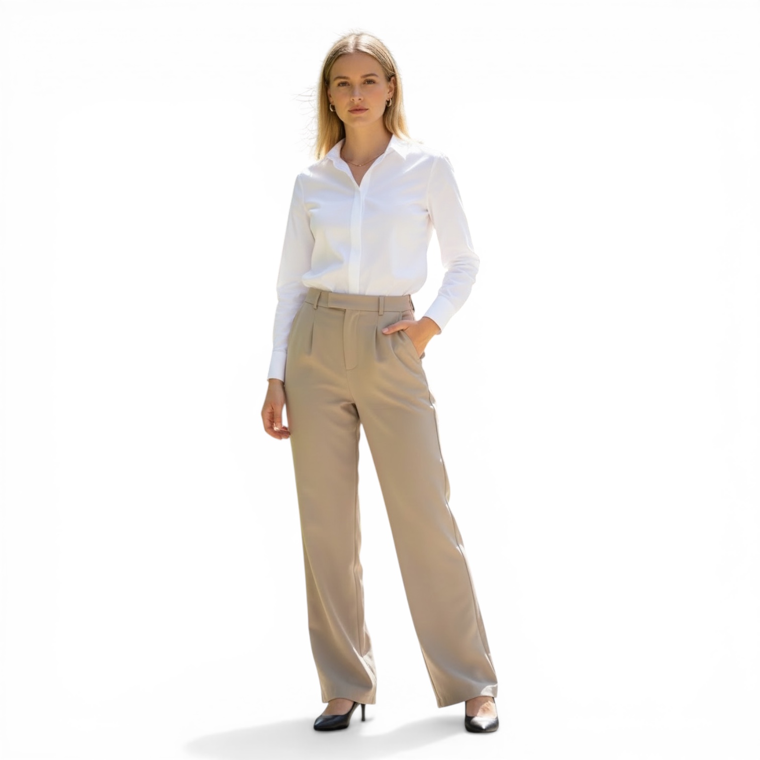 Pair these trousers with a crisp formal shirt (as shown) or a tucked-in blouse for a refined office look. Complete the outfit with heels or loafers for a polished finish.